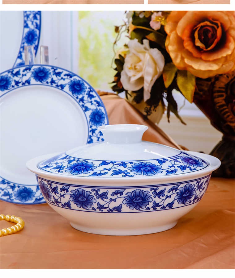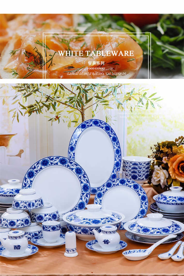 68頭高白青花瓷,一個湯煲,一個魚盤,一個10寸圓盤,一個大馬戈,一個煙缸,一個牙簽筒,兩個醬醋瓶,十個4.5寸碗,十六個8寸碟,四個蓋碗,十個小馬戈,十個5寸骨碟,十個水杯。
