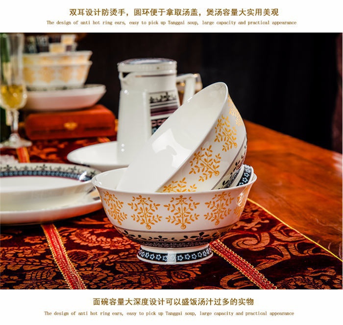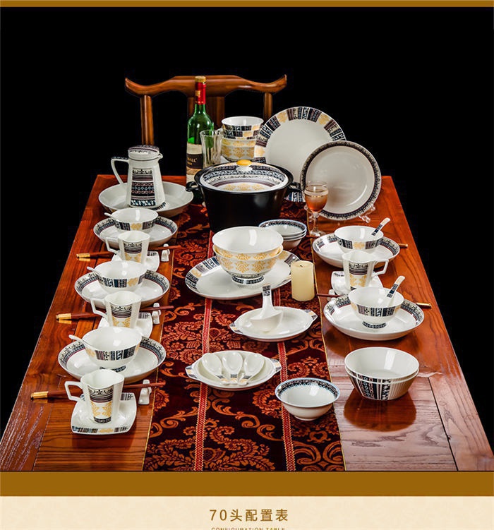 72頭傳奇餐具,餐具60頭 ,一個(gè)湯煲,一個(gè)魚(yú)盤,一個(gè)十寸圓盤,一個(gè)牙簽筒,一個(gè)花籃,一個(gè)大飯勺,兩個(gè)調(diào)料壺,兩個(gè)蓋碗,四個(gè)碗,十個(gè)4.5寸飯碗,十個(gè)4寸湯碗,十個(gè)8寸盤,十個(gè)調(diào)羹,十個(gè)筷子架,