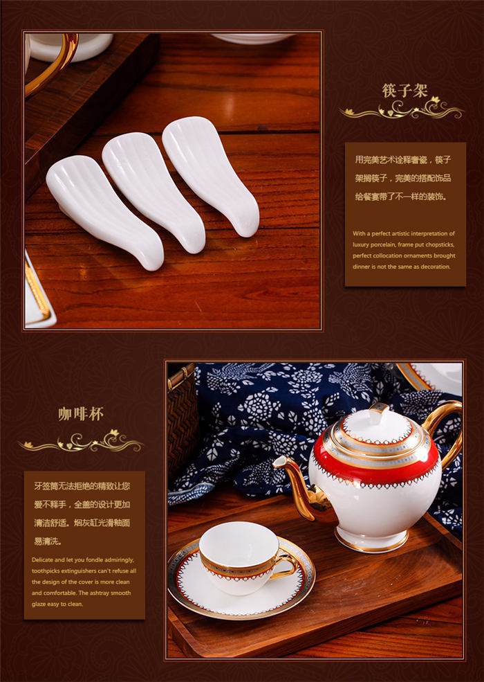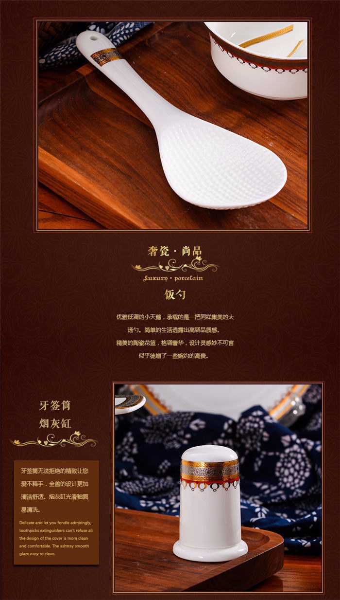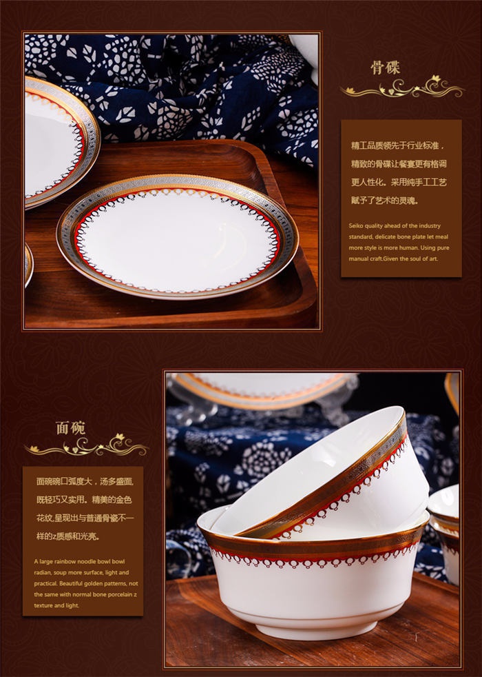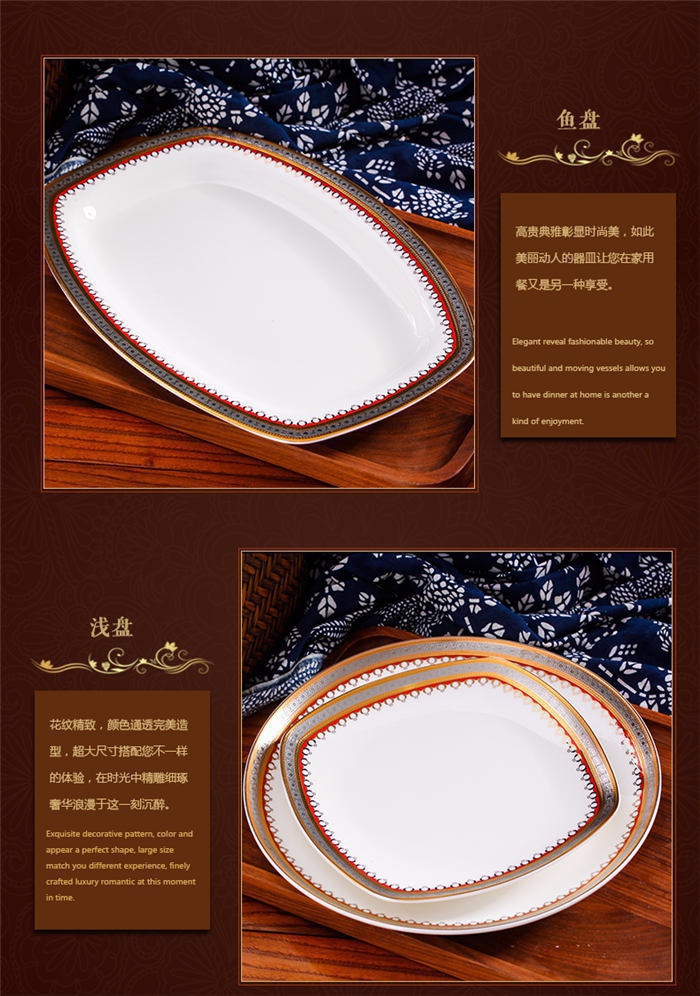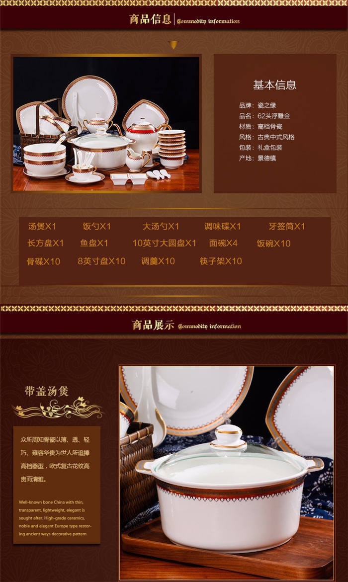 62頭浮雕金,一個湯煲,一個飯勺,一個大湯勺,一個調(diào)料碟,一個牙簽筒,一個長方盤,一個魚盤,一個十寸大圓盤,四個面碗,十個飯碗,十個大骨碟,十個八寸盤,十個調(diào)羹,十個筷子架