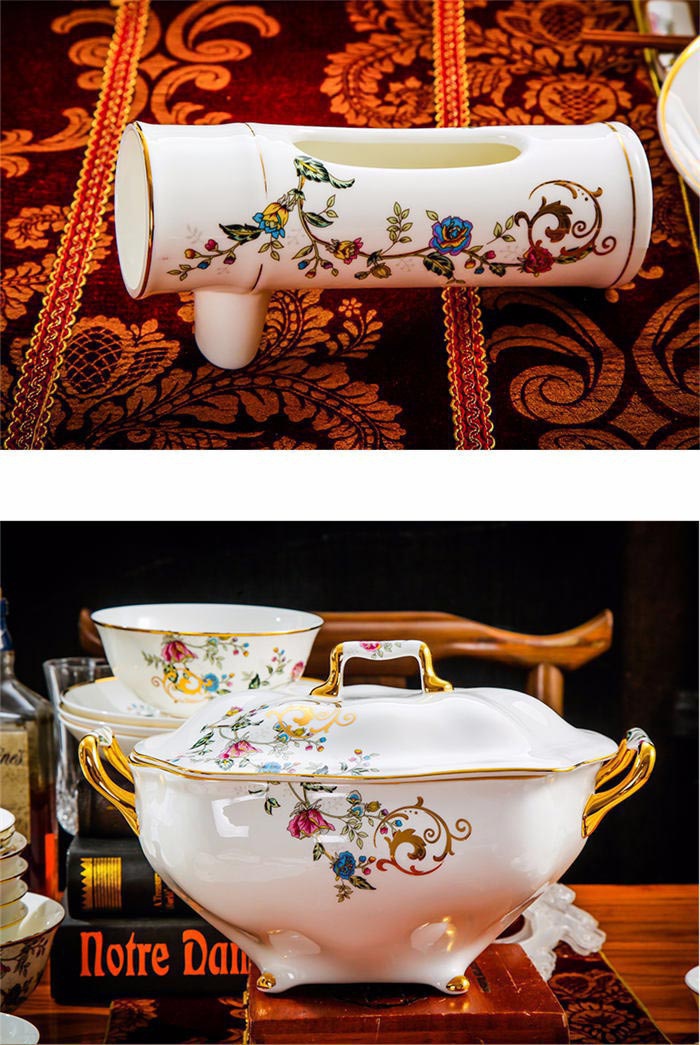 63頭景色滿園 一個湯煲,一個魚盤,一個十寸圓盤,一個飯勺,一個煙灰缸,兩個胡椒瓶,四個面碗,一個雙層水果盤,一個美鵝,十個4.5寸飯碗,十個五寸骨碟,十個八寸盤,十個調(diào)羹,十個筷子架。